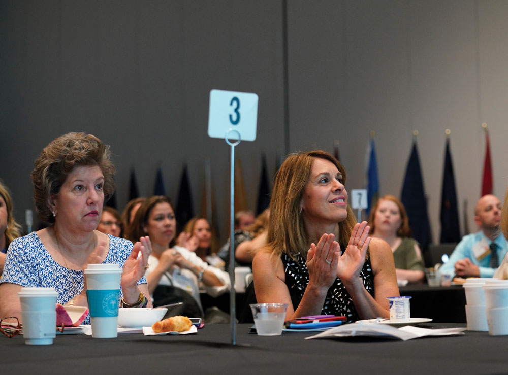 AHIMA Board members Ginna Evans, left, and Valerie Watzlaf applaud a presentation at the House of Delegates.