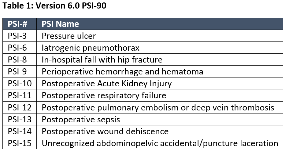 Key updates were made to the PSI program this year for version 6. PSI-8, In-hospital fall with hip fracture, was changed to target all inpatient hip fractures, not just those occurring post-operatively as version 5 measured. PSI-12, Post-operative pulmonary embolism and deep vein thrombosis (DVT), added an exclusion for acute brain or spinal cord injury and removed isolated calf vein DVTs from the inclusion criteria. PSI-15, Unrecognized abdominopelvic accidental puncture/laceration, went through a major change to now include only abdominopelvic surgeries (rather than almost all surgeries), and the inclusion criteria now require a return to the operating room at least one or more days after the initial surgery.Version 6 adds three new PSIs to the PSI-90 composite: PSI-9, Perioperative hemorrhage and hematoma, PSI-10, Postoperative Acute Kidney Injury, and PSI-11, Postoperative Respiratory Failure. PSI-7, Central venous catheter-related blood stream infection, was removed from the PSI-90 composite in version 6. See Table 1 (below) for the current components of version 6.0 PSI-90.